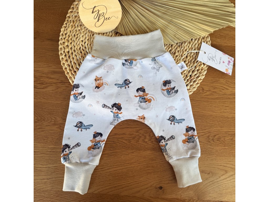 Baggy tepláčky z nepočesané teplákoviny vel. 68, 80. Tepláčky jsou zakončené do nápletů, takže jsou rostoucí.